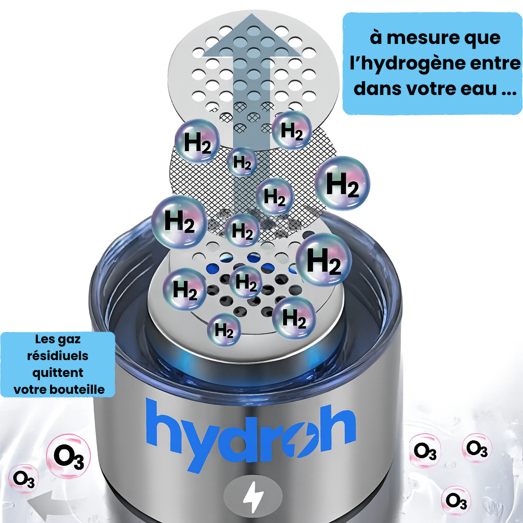 La bouteille d'eau Hydroh™ produit de l'eau hydrogénée en deux cycles. Un cycle de 3 minutes produit une concentration de 1 600 ppb, tandis qu'un cycle de 10 minutes produit une concentration impressionnante de 3 000 ppb(