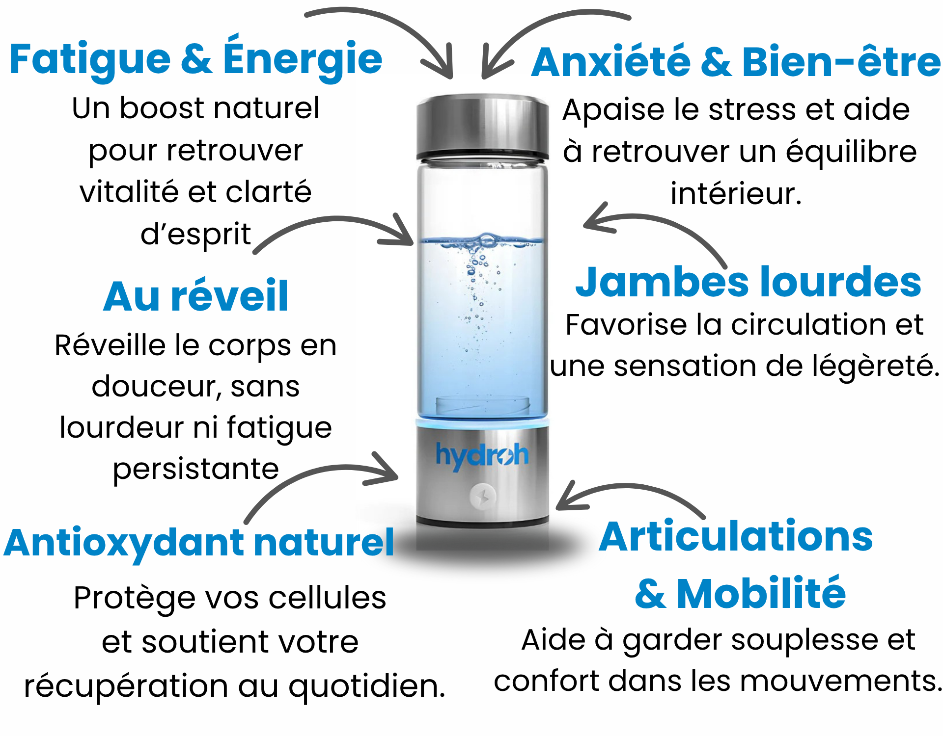 Après deux semaines avec ma gourde Hydroh, tout a changé : je me lève plus légère, j’ai retrouvé ma mobilité et je garde mon énergie toute la journée.
